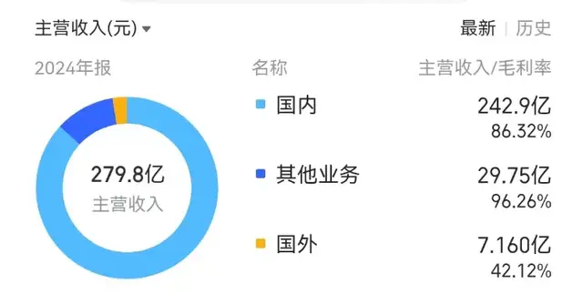 財報顯示,2024年恆瑞醫藥實現營業收入279.85億元,同比增長22.63%,其中國內收入242.94億元,佔比86.81%,國外收入僅7.16億元,佔比僅為2.56%,與全球醫藥巨頭30% - 50%的海外收入佔比差距明顯。