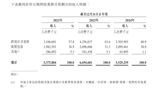 吉宏股份成立於2003年,最初以快消品行業的一站式紙質包裝產品及服務為主業,涵蓋產品設計、工藝設計、技術策劃、運輸物流等多個環節。2016年7月,吉宏股份在深交所主板上市,隨後在2017年開始拓展跨境社交電商業務,並藉助社交電商浪潮實現了海外業務的快速增長。2024年,吉宏股份總營收達到55.29億元,其中跨境社交電商業務收入佔比高達60.9%,成為其主要收入來源。