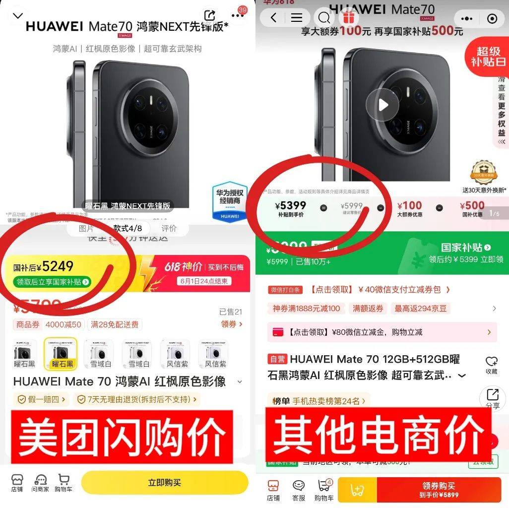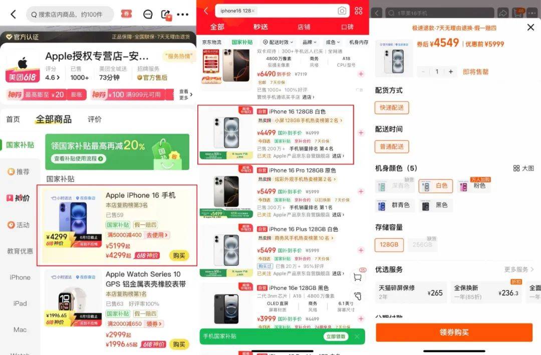 多重讓利之下,撬動價格的效果就很直觀了,我能刷到的就有到手價4299元的iPhone 16,同款機型在其他兩家主流平台國補後價格分別是4499元和4549元,眾所周知,iPhone是手機行業的「硬通貨」,美團作為大促的新玩家進場就能拿到價格優勢,可以説是非常反直覺了。同時,華為手機的價格也被打下來,全系產品基本上都能比電商價低50-300元不等。