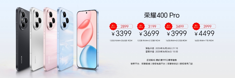 榮耀400系列現已在榮耀商城、授權電商平台、榮耀體驗店、授權零售門店開啓預售,並於6月6日10:00正式開售,共帶來海風藍、流沙粉、攬月銀、幻夜黑4款配色,售價方面,榮耀400標準版12GB+256GB、12GB+512GB和16GB+512GB版本售價分別為2499元、2799元和2999元,國補後售價分別為2124.15元、2379.15元和2549.15元;榮耀400 Pro版12GB+256GB、12GB+512GB、16GB+512GB和16GB+1TB版本售價分別為3399元、3699元、3999元和4499元,國補後售價分別為2899元、3199元、3499元和3999元。