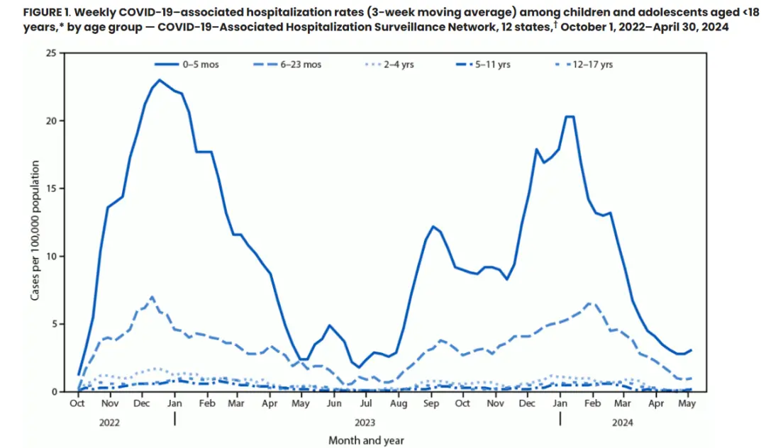 每10萬人中新冠住院人數,6個月以下兒童遠遠高於其它年齡段的兒童,而且實際住院率與65-74歲老人相當,僅低於75歲以上人羣。即使是6-23月兒童,住院率在新冠高峯期也能達10萬人中5人,同樣不可忽視。
