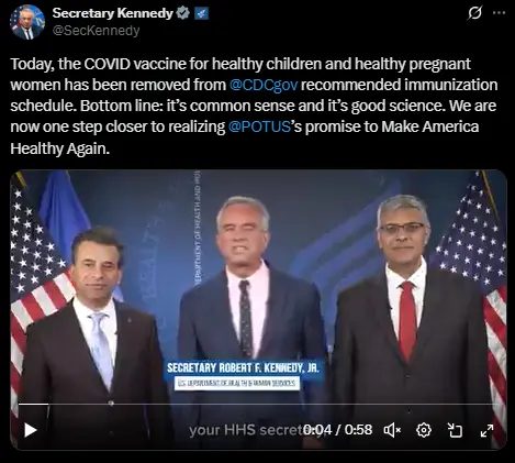 僅僅過去一週,在FDA、NIH新任領導的簇擁下,以反疫苗著稱的小肯尼迪宣佈,CDC將不再推薦孕婦、兒童接種新冠疫苗。