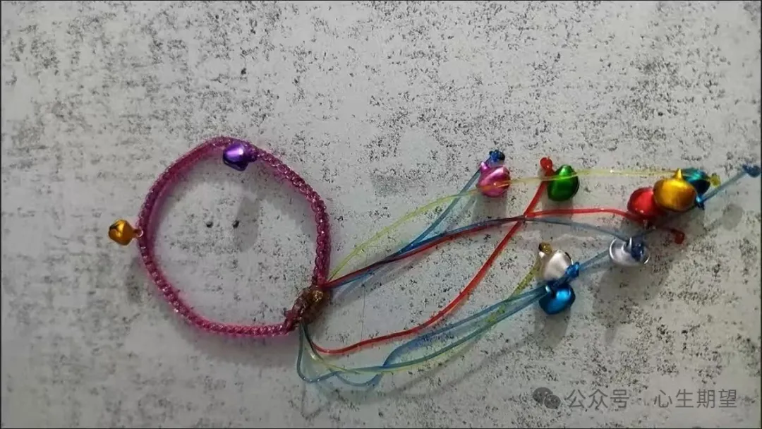 鉛筆盒裏藏着的彩虹繩,是女生的心頭肉。下課鈴一響,馬上就掏出作業本墊着,四根線在指尖繞出“十字結”“吉祥結”,下面還要繫上各種小鈴鐺,五角星,月牙等小配件,編好的手繩系在手腕上,跟同學互相比誰的更好看。