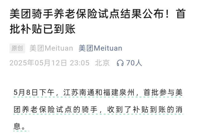 近期,美團已經完成了第一批騎手的養老保險繳納。