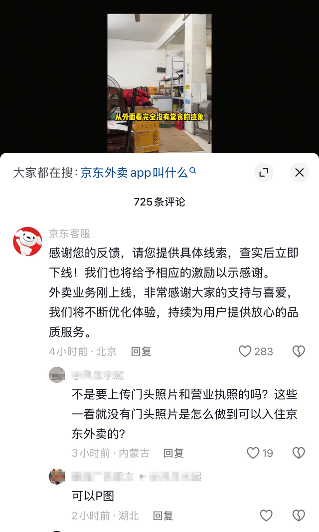 雖然,京東外賣強調品質餐廳篩選,但仍有用户發現部分商家盜用其他城市門店圖片冒充“堂食店”。