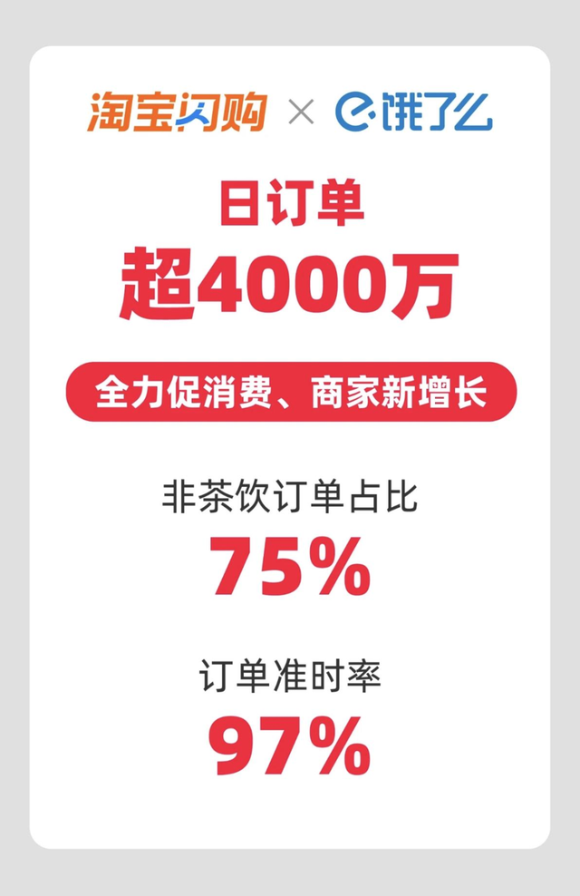 而餓了麼也於4月底聯合淘寶閃購,共同推出“餓補超百億”補貼活動,目前淘寶閃購的日訂單量已經突破4000萬單。
