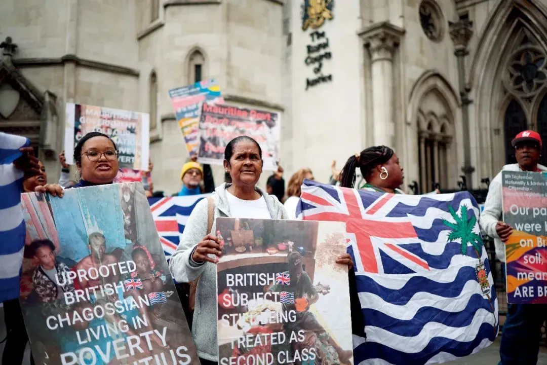 5月22日,查戈斯羣島社區成員和支持者在倫敦高等法院外集會,等待關於查戈斯羣島命運的聽證會舉行。圖/視覺中國