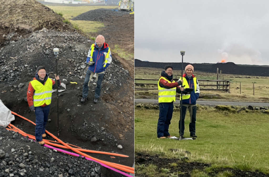 李嘉軒(左)與同事張順(右)在Grindavík小鎮進行測量工作,左圖中粉色的線纜就包含這項工作中使用的光纖 | 李嘉軒供圖