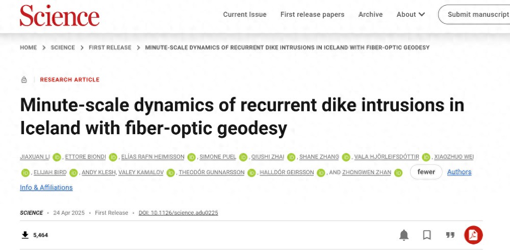 2025年4月24日,一篇關於火山噴發監測與預警的研究登上Science。論文第一作者、北京大學校友、時任加州理工學院地震實驗室的博士後李嘉軒(現為休斯敦大學助理教授),利用新興的分佈式聲學傳感(DAS)技術,通過改造通信光纖,實現了對火山地下活動的分鐘級高精度監測。這是業內首次利用DAS技術觀測自然現象中的測量信號,此次成功嘗試,為火山監測和災害評估提供了關鍵依據。