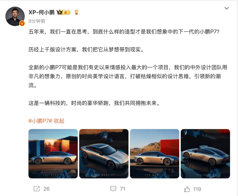 此外,大改款的全新一代P7則承載着幫助小鵬重返30 萬級純電轎車市場的重要使命,何小鵬更表示,全新的小鵬P7 “可能是我們有史以來情感投入最大的一個項目”。