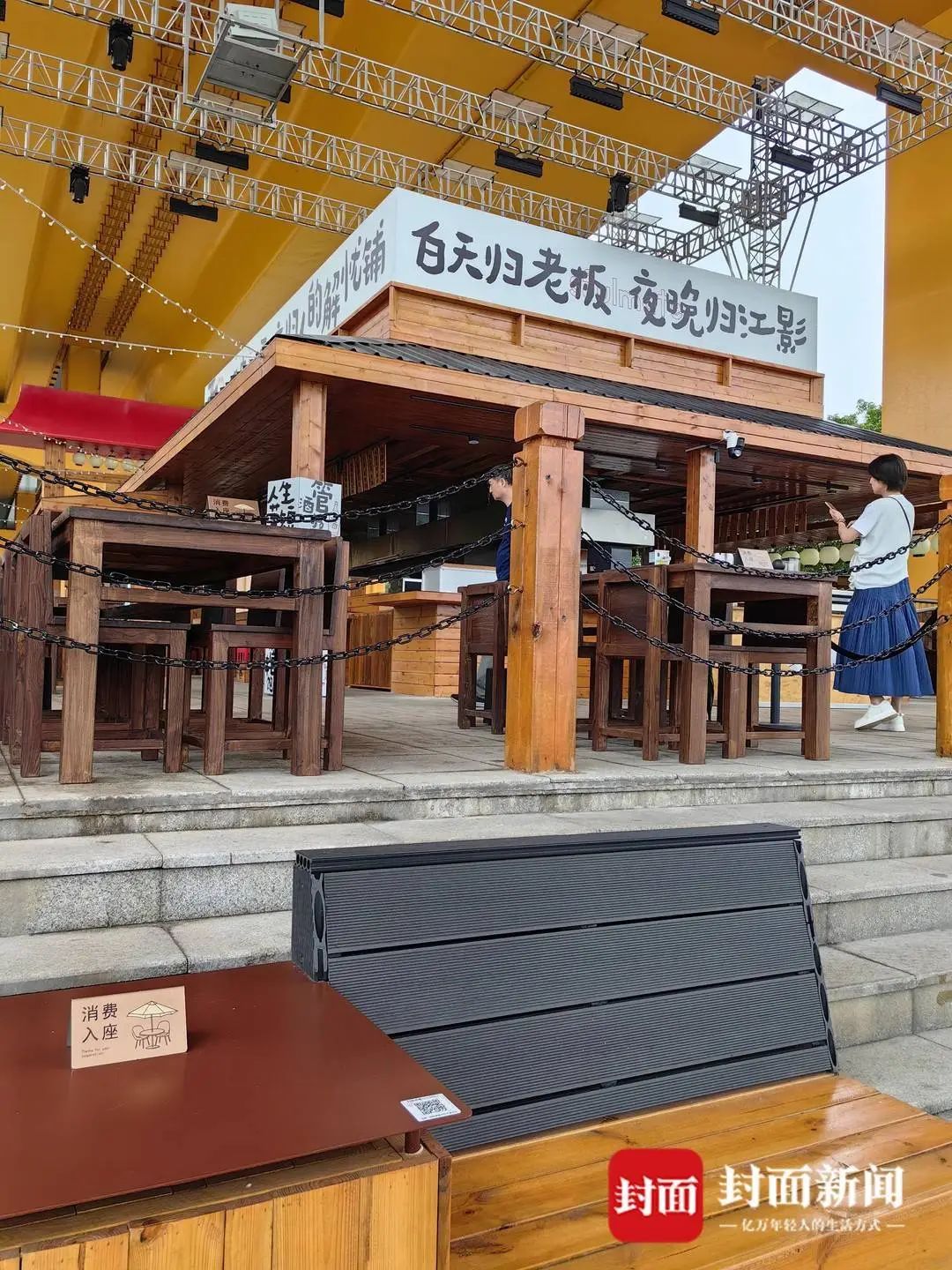 酒肆周邊的餐桌,以及前面靠江的通道區小桌,上邊都擺着“消費入座”的桌卡,桌上有點餐二維碼。