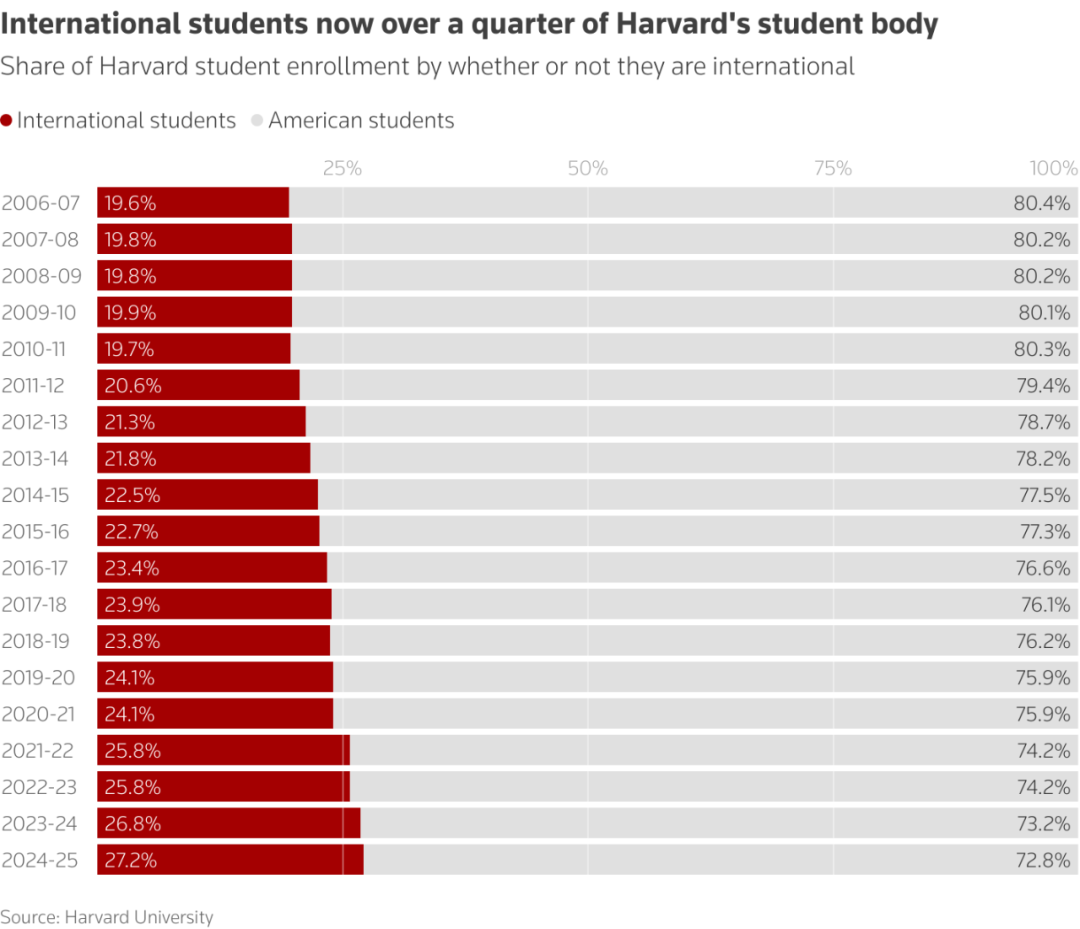 特朗普政府的決定可能會影響到該校數千名國際學生。學校數據顯示,上個學年,哈佛有超過6700名國際學生,佔學生總數的27%。