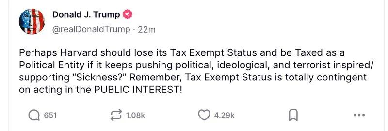 特朗普在真相社交上發帖稱“哈佛大學應該失去免税地位”。特朗普稱:“這是他們應得的!”