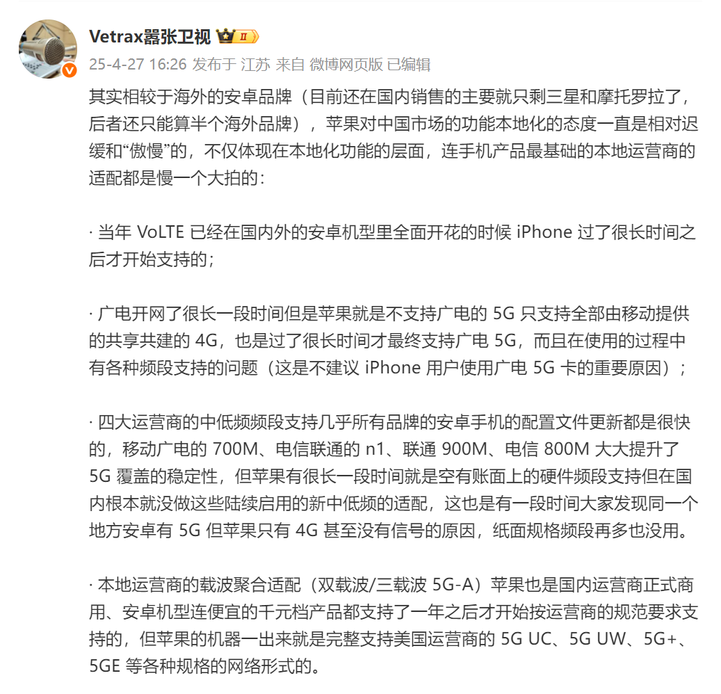 之所以會出現這種現象,是因為蘋果為了確保在全球多個國家的頻段兼容性,在產品定義階段就採用了 「最低公約數」的方案,不像國產廠商那樣會針對國內運營商的特殊頻段或者定製化的技術,進行深度適配。