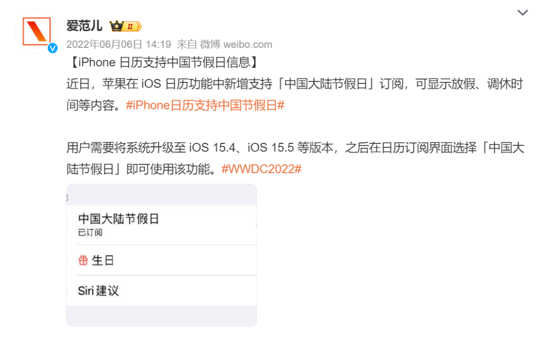 當時很多用户為了圖省事,選擇直接在手機裏裝個第三方日曆,直到 iOS 15.4 發佈後,iPhone 才首次支持 「中國大陸節假日」訂閲,國內 iPhone 用户終於可以直接在日曆裏,勾選顯示法定節假日以及調休安排。