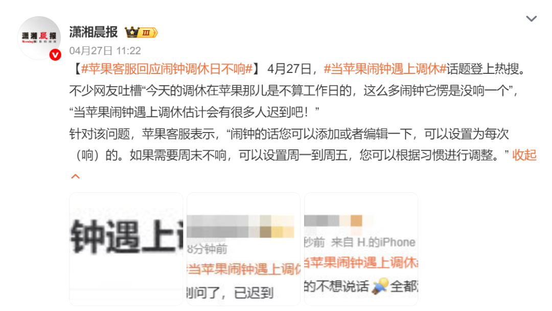 前陣子,託尼在刷微博的時候,發現蘋果上了熱搜,好奇點進去一看,好傢伙,敢情是每年都會上演幾回的 “ 老戲碼 ” ——#蘋果客服回應鬧鐘調休日不響#。