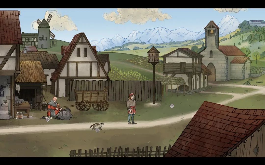 比如Pentiment的這個場景中(下圖一),開啓AI 3D後,近景的人物和房子,中景的建築和草地,遠處的山巒,都被準確清晰地裸眼3D化,實際觀感有點像小時候玩的3D書(下圖二)。