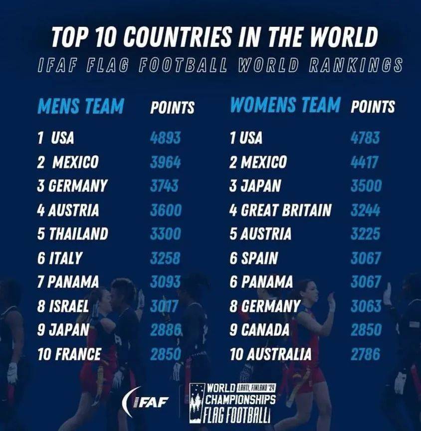 據國際美式橄欖球聯合會(IFAF)在2024年公佈的排名顯示,目前世界範圍內腰旗橄欖球男子前6名的隊伍分別為美國、墨西哥、德國、奧地利、泰國和意大利;女子前6名的隊伍則是美國、墨西哥、日本、英國、奧地利和西班牙——中國男隊和女隊均不在前10名的榜單上。