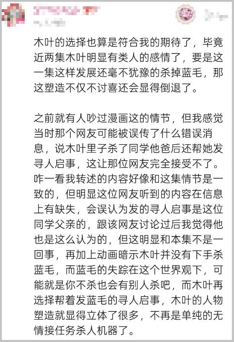 同時她還要接普通的殺人任務,其中有一個目標就是暗殺對自己很好的同學的父親,前一秒大家還在温馨的校園日常,下一秒放學就各回各家,我殺你爸,沒有感情像個偽人。