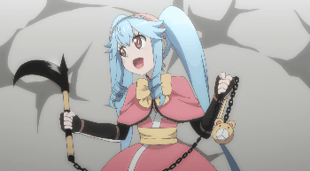 再比如這個藍髮雙馬尾,出場時又萌又嗲,雖然手裏盤着鐮刀,但一口一前輩,極盡可愛。
