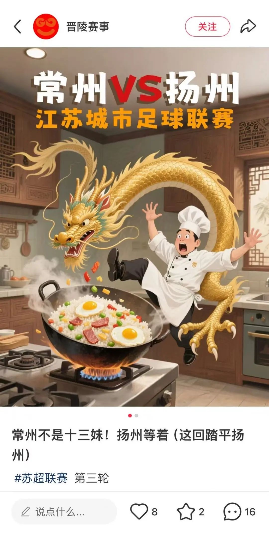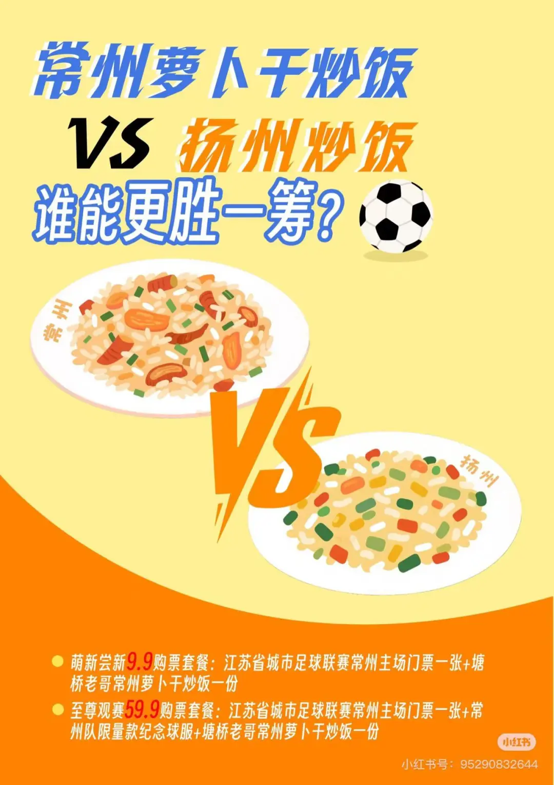 市級單位把江蘇城市足球聯賽當作文體領域的頭等大事,而下面的市足球協會為了拉更多人進場,也使出了渾身解數。比如常州市足協就推出了“買門票送炒飯”的福利套餐,花9.9元可以獲得一張門票和一份蘿蔔乾炒飯,花59.9元的話,可以在9.9元套餐的基礎上再獲得一件常州隊限量款紀念球服。有意思的是,常州隊推出這一政策的那場比賽,對手剛好是以炒飯著稱的揚州,這屬實是在挑釁揚州人了。