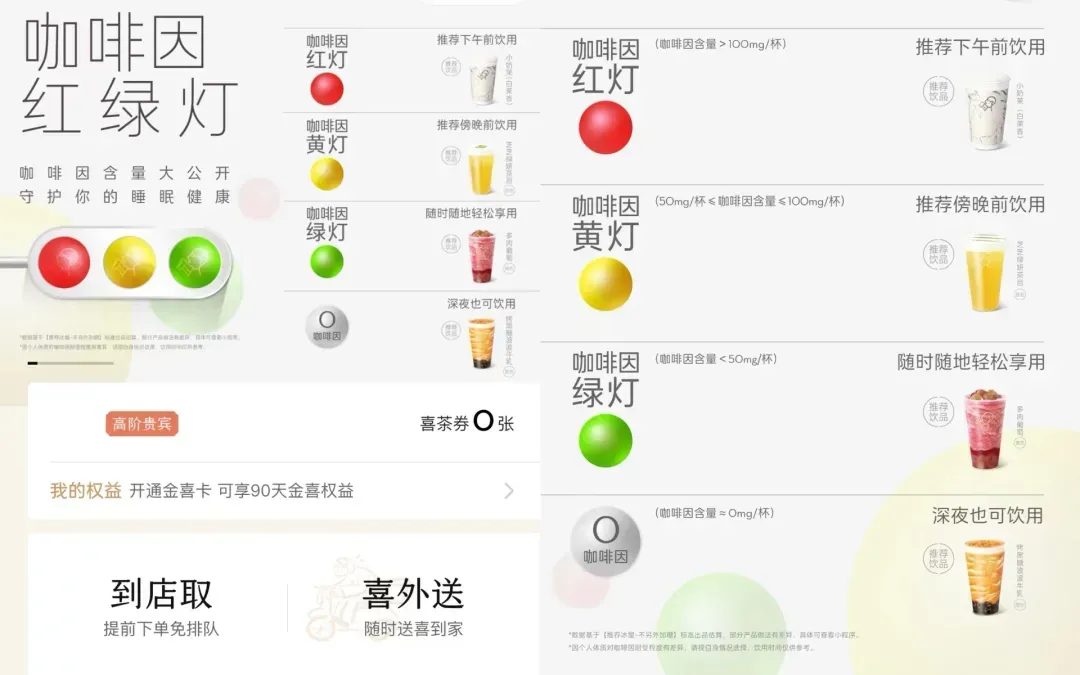 此前,喜茶也用“咖啡因紅綠燈”將現制飲品的咖啡因含量可視化。