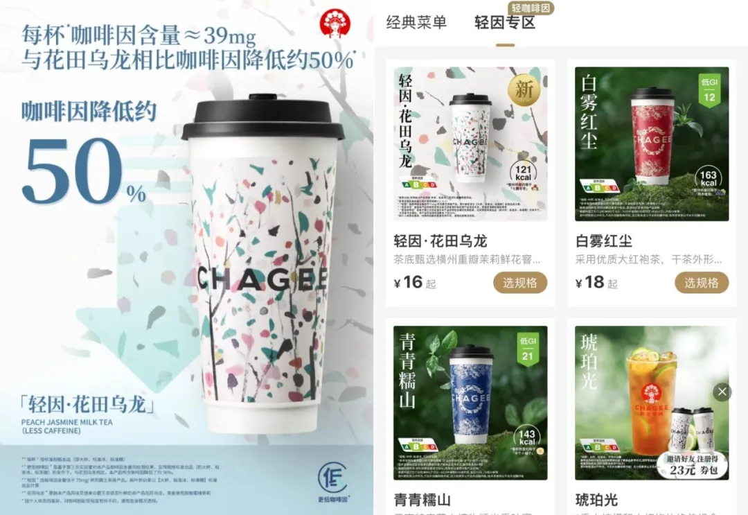 5月23日,霸王茶姬推出新品“輕因·花田烏龍”,每杯咖啡因含量約39mg,相比普通花田烏龍降低了約50%,價格與正常飲品相同。