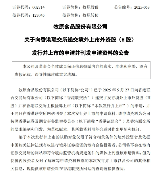 5月27日,全球生豬養殖龍頭牧原股份(002714.SZ)正式向港交所遞交上市申請,邁出其國際化資本戰略的關鍵一步。