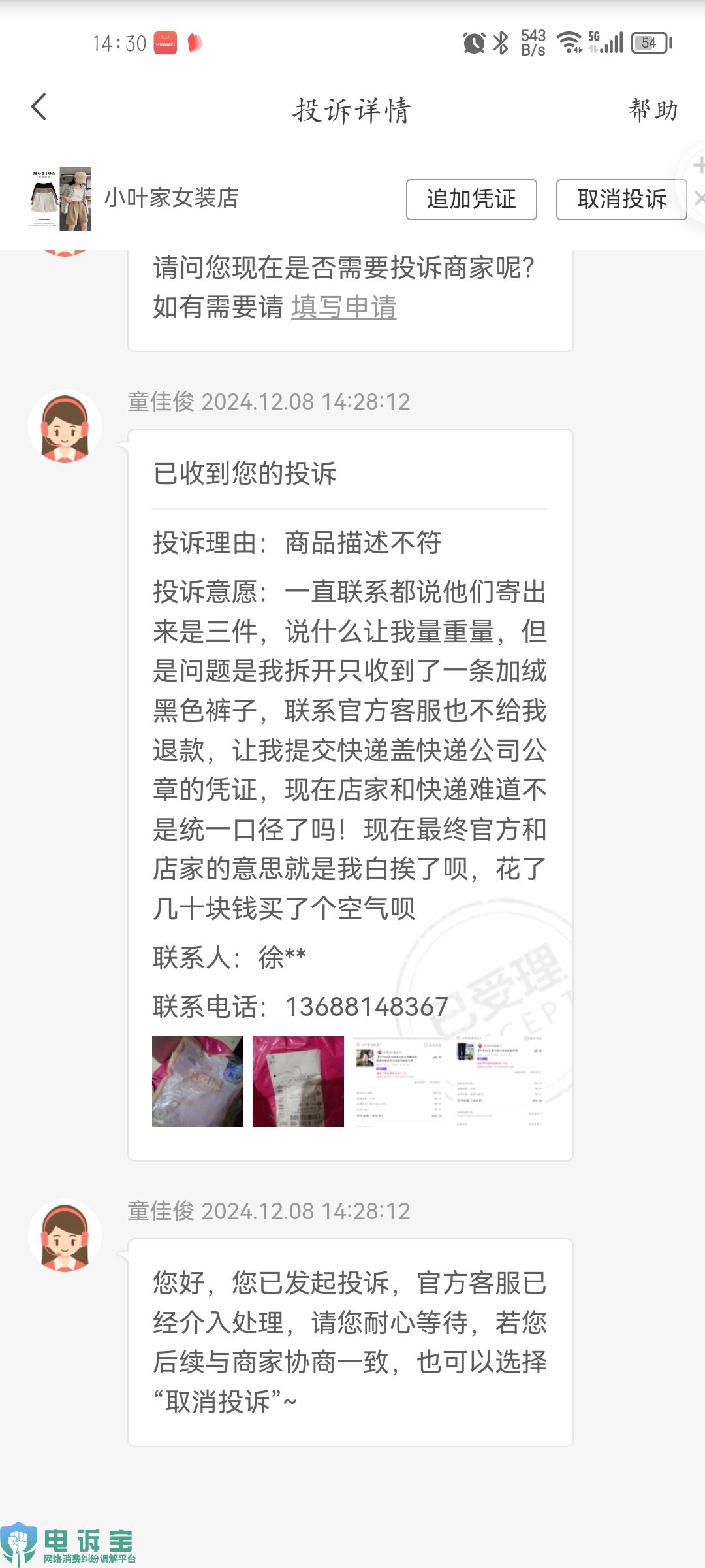 1月6日,四川省的徐女士向“電訴寶”投訴稱,其於2024年11月7日在蘑菇街平台的小葉家女裝店購買了兩單褲子,一單包含兩條黑色男士褲子,另一單為一條加絨女士褲子。然而,她收到快遞後拆開發現僅有一條黑色男士褲子。她立即聯繫商家反饋問題,商家以發貨總重量為1.2千克為由推脱責任,但徐女士在家稱重後發現收到的褲子僅四百多克(不含包裝)。