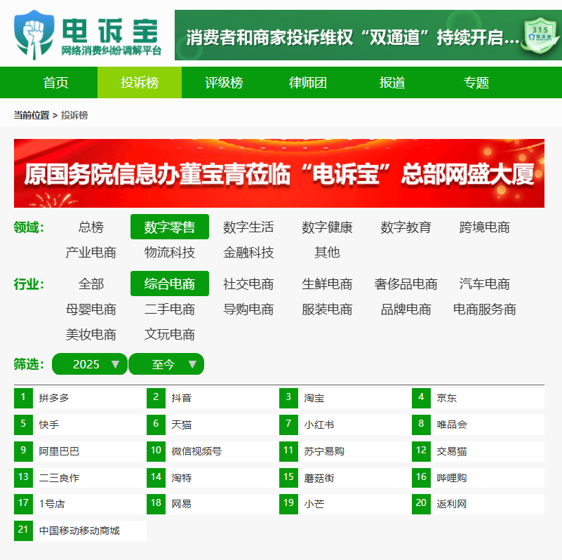 根據“電訴寶”2024年至今受理的數字零售中直播電商領域用户有效投訴顯示(依據投訴量排行),蘑菇街排名第15位,最新評級為“不建議下單”。同樣被投訴的類似平台還有:拼多多、抖音、淘寶、京東、快手、天貓、小紅書、唯品會、阿里巴巴、蘇寧易購、交易貓、二三良作、淘特、嗶哩啦、1號店、網易、小芒、返利網、中國移動移動商城等
