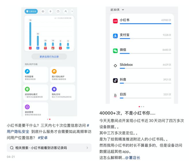 **今年3月底,多位用户集中反映小紅書後台持續高頻獲取用户信息,還被多家媒體報道。**有用户最高3天內被訪問1.7萬次,包含定位、照片與視頻、設備狀態、日程、剪貼板等。還有用户近30天內小紅書應用訪問總量高達9.2萬次,而第二位的微信,同期只有911次。