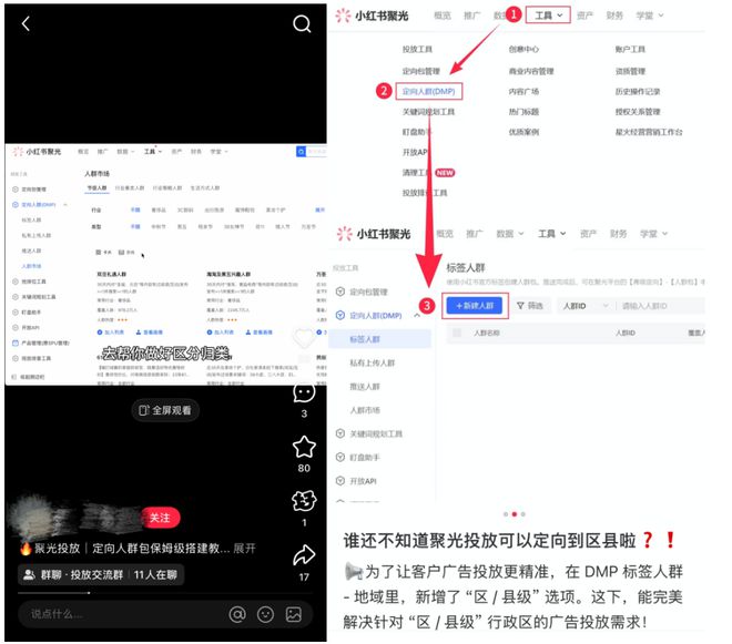 **有小紅書用户表示,在小紅書聚光平台後台,廣告主有人羣市場的選擇,小紅書會幫廣告主做好人羣分類。**聚光投放的定向人羣如今也已經可以細化到區縣一級。