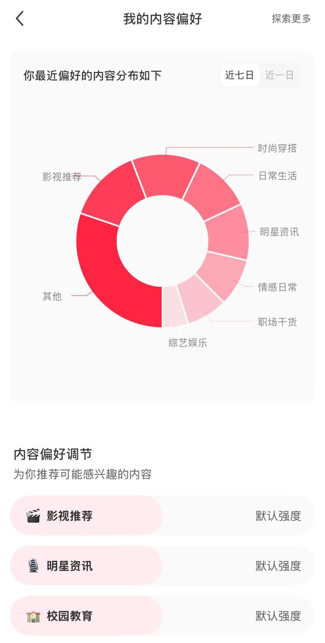 小紅書也在此次治理的範圍之內,為此,小紅書上線“內容偏好評估與調節”“探索更多”等功能,方便用户一鍵操作,瀏覽更多元豐富的推薦內容。