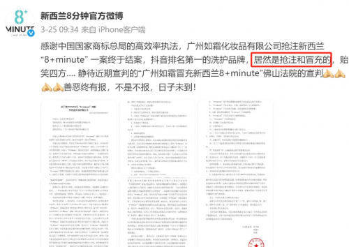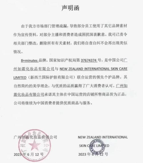 除了代言合作的翻車,彈動品牌關聯公司的問題更是令人瞠目結舌。今年 3 月,新西蘭 “8 + minute” 品牌官方微博發文,揭露了彈動品牌關聯公司廣州如霜化妝品有限公司搶注其商標的侵權行為。早在 2023 年 4 月,擁有 4200 萬粉絲的快手頭部網紅 “週週珍可愛” 就在直播間大力推銷所謂的 “新西蘭 8 + MINUTES 魚子醬洗髮水”,聲稱這是 “新西蘭小眾高端品牌”,甚至還搬出 “新西蘭小姐代言” 作為噱頭,然而實際上這是一個搶注和冒充的品牌。新西蘭正版 “8 + minute” 品牌曾直接打假,聲明從未授權廣州如霜使用其品牌。面對質疑,廣州如霜先是發佈聲明稱是市場部門管理疏漏,部分員工使用了其他品牌素材作為宣傳資料,對部分主播和消費者造成了困擾並深表歉意。但隨着新西蘭正版 “8 + minute” 發佈視頻澄清,廣州如霜又改口稱兩個品牌是一家公司、產品版本不同,試圖混淆視聽。據媒體報道,該 “李鬼” 產品已通過 1370 多名達人進行推廣,涉案金額高達 5000 萬。而廣州如霜的監事,正是彈動品牌關聯公司廣州聞央生物科技有限公司的大股東邱超華。