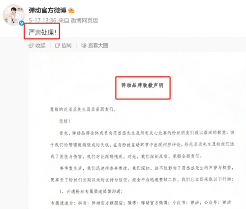 近期,彈動生物科技(廣州)有限公司發佈了一份《致歉聲明》。聲明中稱,由於公司管理方面的疏漏,在與範丞丞合作的互動環節出現了不當評論,給範丞丞及其粉絲造成了傷害,公司對此深表愧疚,並表示願意承擔全部責任。同時,公司還提到已在全平台進行整改,開通了專屬反饋渠道,並且會對涉事員工及團隊進行嚴肅追責。
