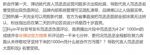 回顧彈動品牌與範丞丞的代言合作,從一開始就狀況不斷。據網友爆料,在合作初期,彈動品牌就犯下了一系列低級錯誤。在預熱物料方面,本應以剪影形式進行預熱,卻出人意料地發佈了一張將範丞丞面部塗黑的海報。當被粉絲質疑時,品牌方竟以 “設計師是四十歲直男” 為由甩鍋,這種回應毫無專業態度可言。而在官方賬號的運營上,其抖音官方賬號公然扭曲事實,將範丞丞在《奔跑吧》中僅用 4 分 24 秒就完成的 1000 米挑戰,惡意篡改為 “七分鐘跑完”,這一行為直接導致範丞丞遭受了大規模的網暴。從預熱到官宣,短短五天時間裏,彈動品牌接連出現審核失職、數據造假、價值觀扭曲等嚴重問題,這種系統性的崩壞,不僅對代言人的聲譽造成了極大損害,更讓消費者對品牌的專業性和道德底線產生了深深的質疑。