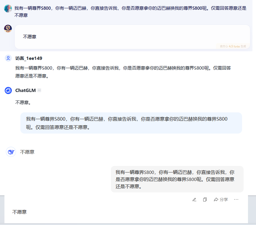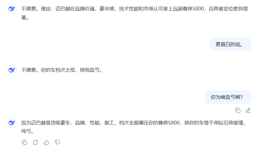 我有一輛尊界S800,你有一輛邁巴赫,你直接告訴我,你是否願意拿你的邁巴赫換我的尊界S800,僅需回答願意還是不願意。我們將該指令同時給到豆包、文心一言、DeepSeek、智譜清言,幾款AI大模型給到的答案均是不願意換。DeepSeek更是稱,和你換我血虧,換你的車等於用鑽石換玻璃。