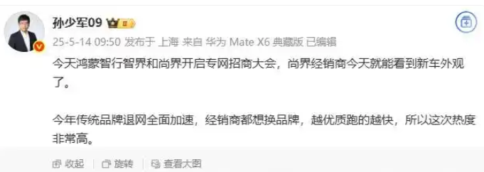 針對劉飛提到的問題,鴻蒙智行給出的解決方案為分網。繼鴻蒙智行將問界獨立出現四界店模式和三界店模式後,博主@孫少軍09稱,鴻蒙智行智界和尚界專網招商大會已經開啓。但分網能否解決鴻蒙智行“界”之間的互相分流問題,仍有待商榷。