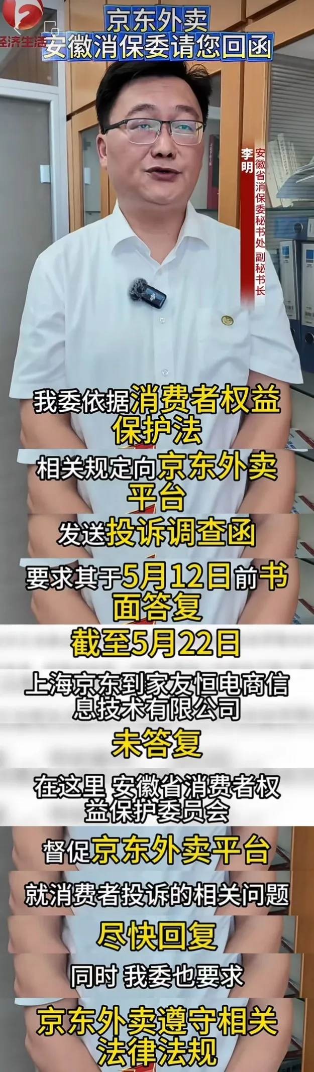 同日,據媒體報道,安徽省消保委近期前往合肥部分京東外賣店鋪實地調查,發現實際環境髒亂差,沒有堂食場所,與線上環境圖片以及“堂食餐廳”標籤不符。對此,安徽省消保委秘書處副秘書長李明表示,近期消保委收到多起消費者投訴,反映京東外賣平台商家通過上傳不實圖片虛構品質堂食,平台方對商家信息審核不嚴,形成了一定消費落差。