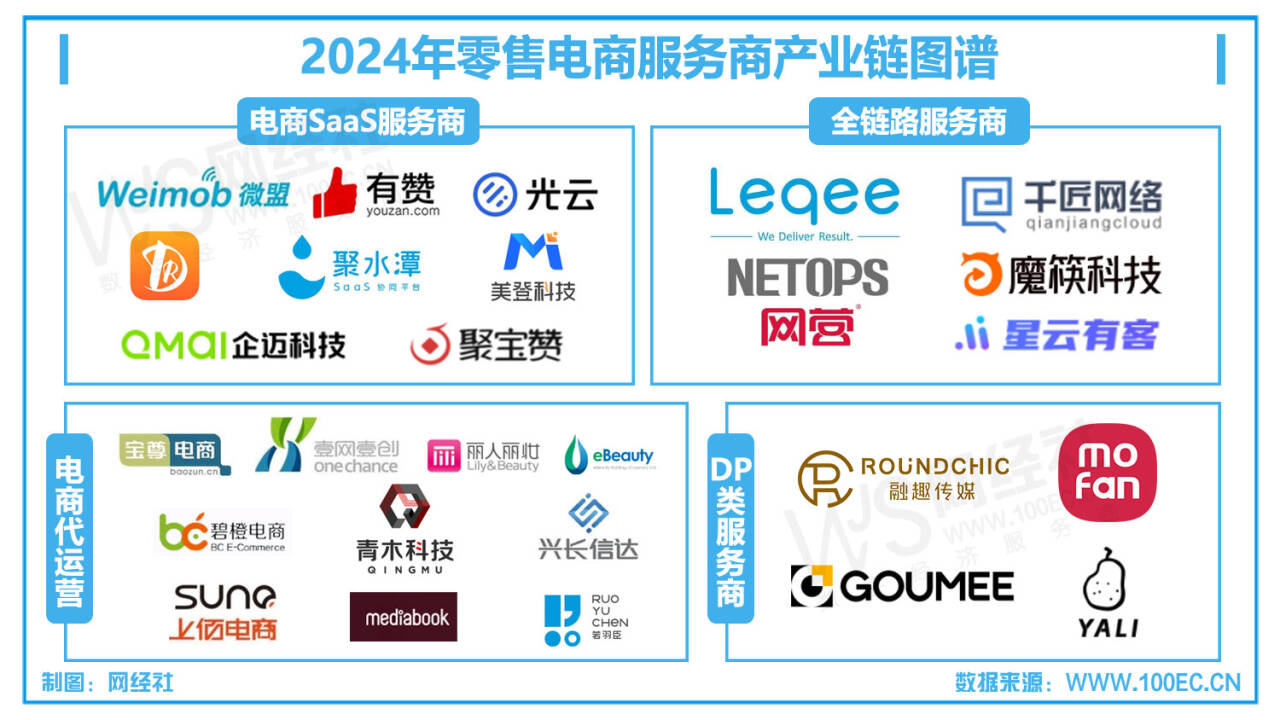網經社企業庫顯示,除了文中所提上市公司及凱詰外,電商代運營公司還包括悠可、碧橙電商、上佰電商、火蝠電商、索象電商等。此外,電商服務商主要玩家還包括:電商SaaS服務商類:微盟、有贊、光雲科技、聚水潭、企邁科技;全鏈路服務商:樂其電商、千匠網絡、網營科技、魔筷科技;DP類服務商:融趣傳媒、構美等。