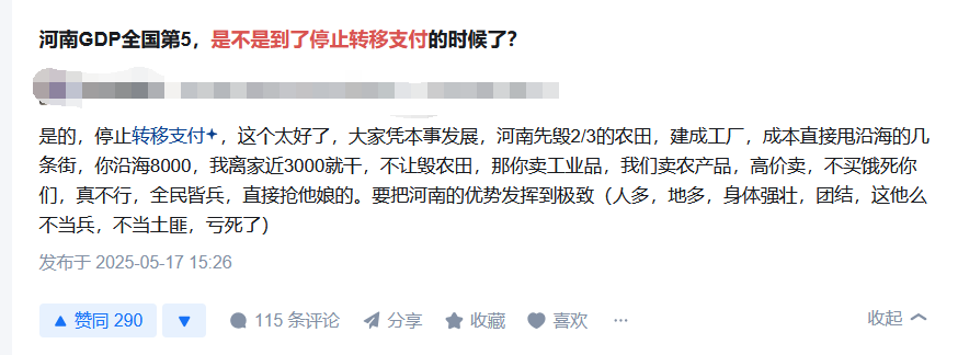 打個比方,比如網上經常有類似“某某省GDP已經多少多少了,是不是該停止對該省轉移支付了”。這就是典型的以單純利潤價值為導向的視角,認為誰創造了直接利潤誰就有價值,而把轉移支付當成了扶貧和做慈善。實際上,之所以叫轉移支付而不是轉移援助,就是説你要為別人給你提供的,對你創造利潤有關鍵作用的生產要素支付回報。