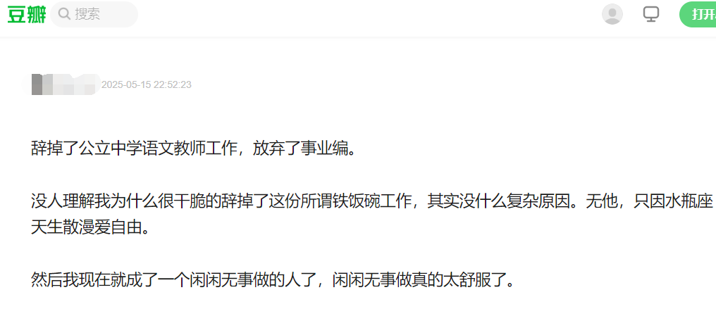 一方面,羨慕那些日常時間自由,可以旅遊探店兼顧賺錢和“詩與遠方”的自媒體博主;一方面,市場經濟內的崗位需求變得比以往更加不穩定,又讓年輕人更加渴望非市場化的,入職就等於上岸的體制類工作。然而這類工作一旦“上岸”之後,也就意味着想辭職都變得輕易不可能,失去了在市場經濟中離職或裁員後會獲得一段雖然沒保障但可以自由“喘息”的機會。由此常常會陷入一種更矛盾的,對上班和工作意義進行內耗式追問的心態中。