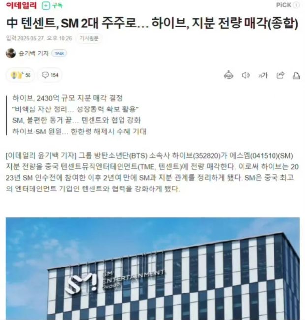 韓媒5月27日消息,HYBE將其持有的SM娛樂全部股份出售給TME騰訊音樂娛樂集團,合計2430億韓元,約12.7億人民幣。交易達成後,TME將以近10%的股份成為SM娛樂第二大股東。