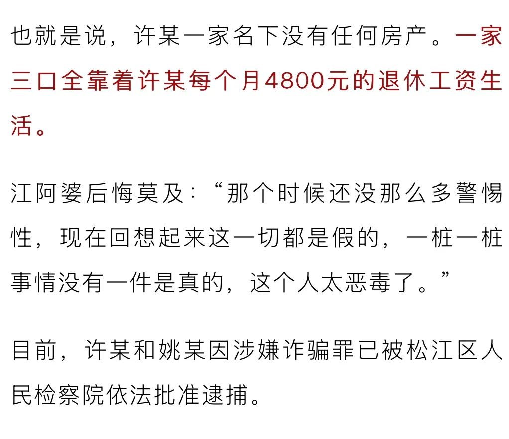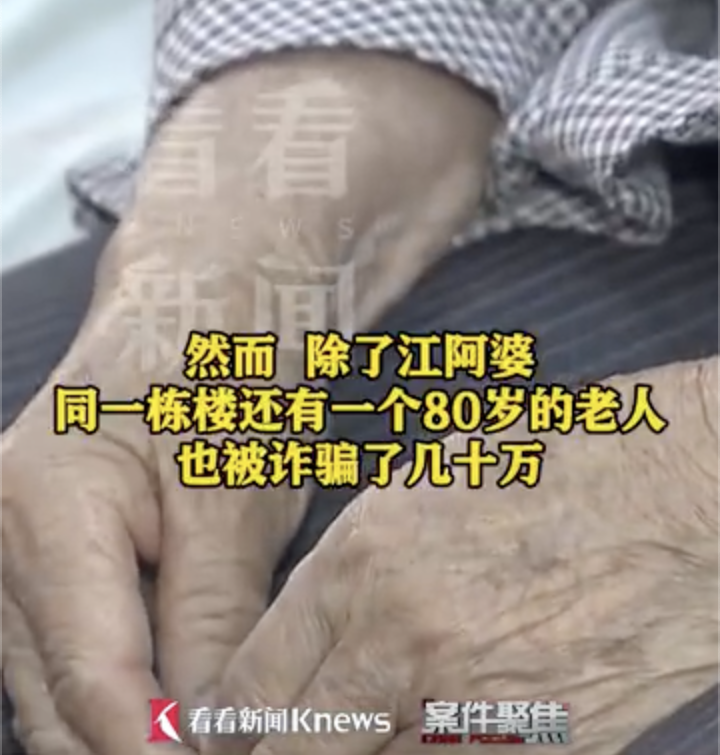 除了江阿婆,同一棟樓裏,還有一個80歲的朱阿婆也被許某一家以相同的手法詐騙了幾十萬。