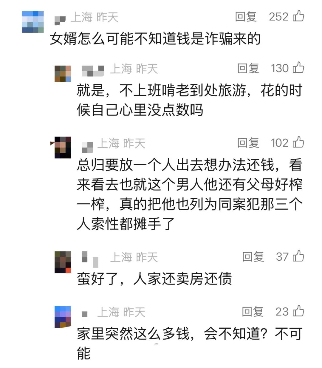 女婿秦某雖説也花了不少騙來的錢,但他對於詐騙沒有明知的故意,因此警方最終認定他並不涉案。此外據瞭解,姚某丈夫的父母已經賣掉他們在外地唯一的房子,用於還債。
