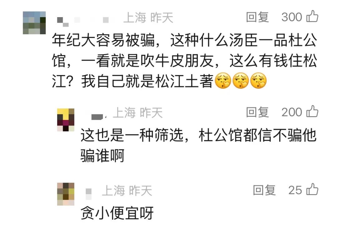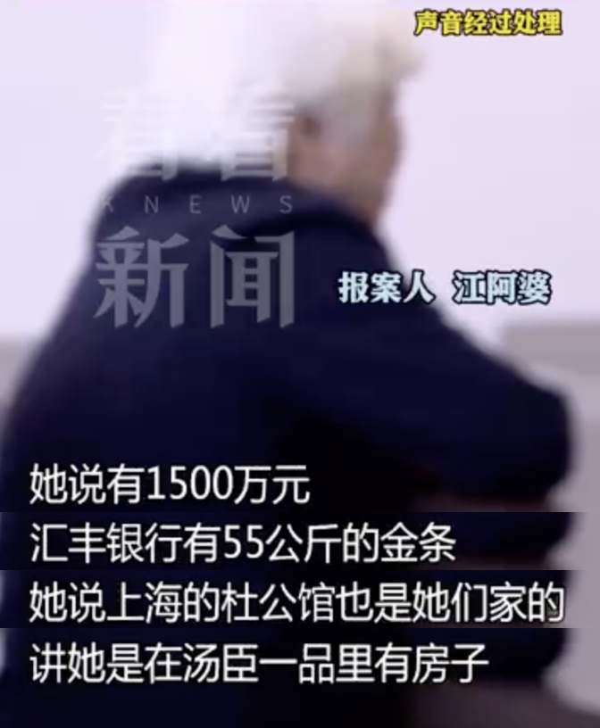 江阿婆:“她説上海的杜公館也是他們家的,房間裏面還有什麼古董,還看了金條、金元寶,外地也有房子,上海也有別墅,然後講湯臣一品有房子,物業費要1萬塊錢什麼的。”