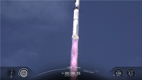 當地時間清晨6時40分,搭載着B14.2超重型助推器和S35飛船的"星艦"火箭從得克薩斯州博卡奇卡發射場騰空而起。直播畫面顯示,發射初期一切順利,火箭在震耳欲聾的轟鳴聲中衝破雲霄。升空5分鐘後,超重型助推器按計劃與飛船分離,開始快速下降。與此同時,星艦飛船表現穩定,其搭載的六台發動機持續工作,推動飛船加速進入太空。