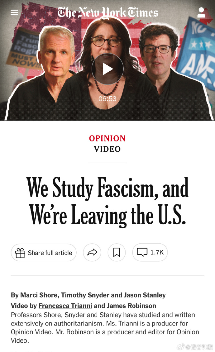 【然後,是“憤怒”】:“可是,即使這樣,對美國造成的傷害也是不可逆的。你看前幾天《紐約時報》發的文章了嗎?報道了三位耶魯大學的知名教授,選擇離開美國,文章標題是《‘我們是研究法西斯主義的,現在我們要離開了’》。特朗普政府現在各種攻擊高校,把‘言論自由’之類的flag都碎成渣了,不僅是自毀美國大學競爭力這麼簡單,更是會毀掉美國的制度和信譽。”