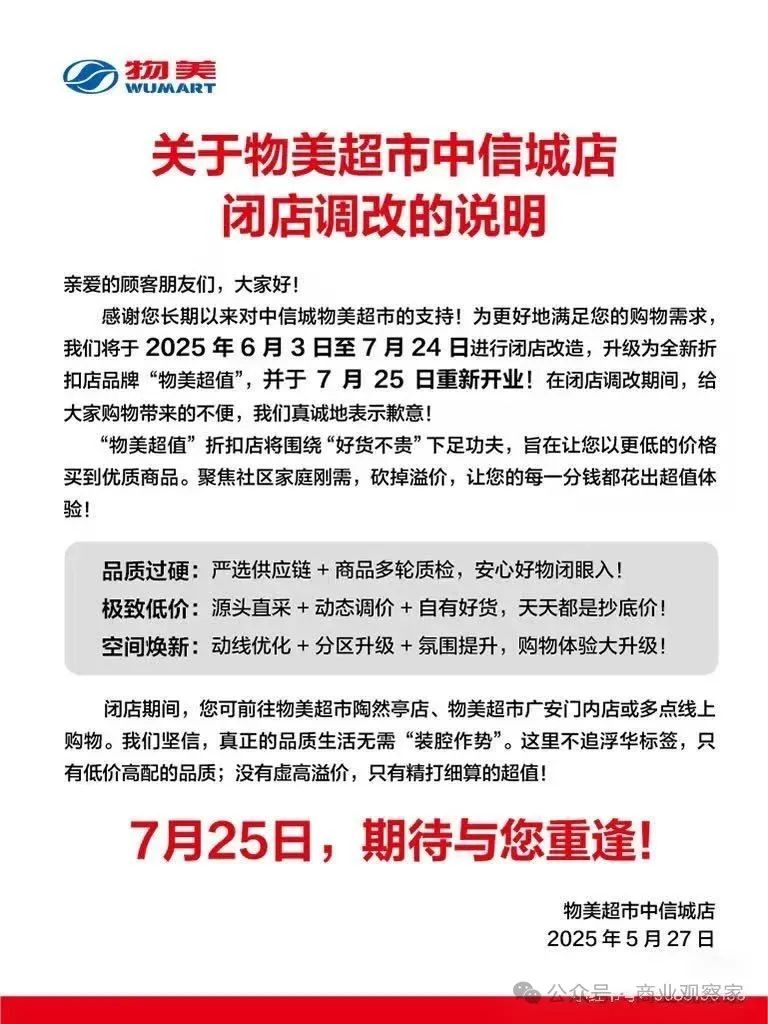 物美集團宣佈推出折扣店新品牌“物美超值”,物美將在6月3日至7月24日,對其於北京市場的中信城店、西山楓林店、麗澤橋店、朗清園店、和平新城店、豐台新業廣場店進行閉店改造,將這6家店改造成為折扣店。