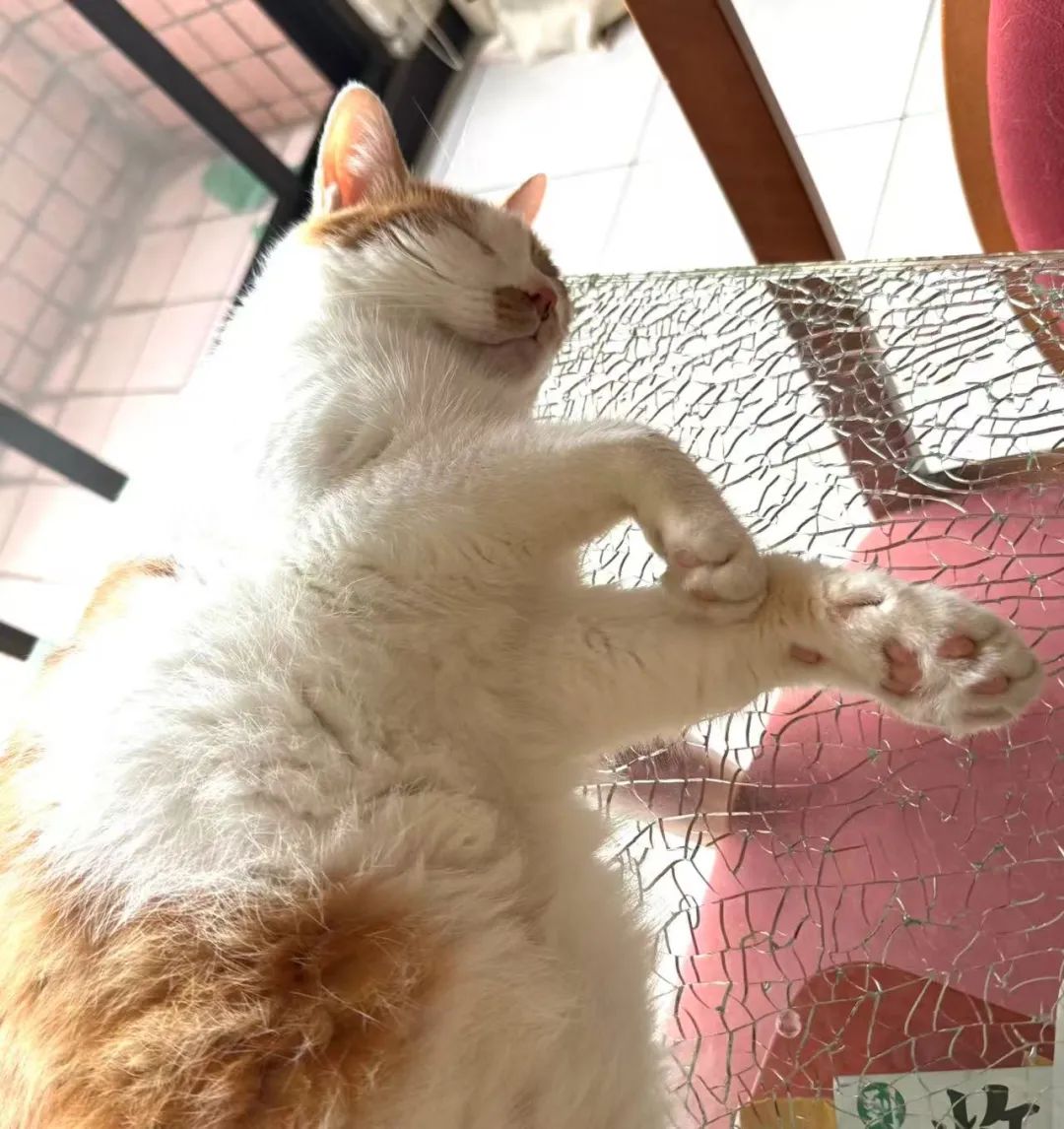 因為台灣天氣熱,非常喜歡睡在玻璃餐桌上的竹。